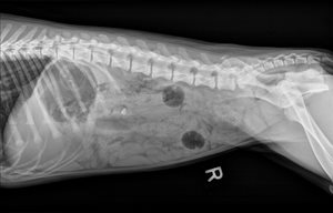During our exam, we noticed that Molly had two retained deciduous teeth. Deciduous teeth are retained when adult teeth do not push out the puppy teeth. The result is crowding in the mouth and subsequent increased risk of dental disease. While in the exam room, Molly continued to gag and vomited a small amount of bile. Her abdomen was mildly painful when palpated, and we were able to feel an unusual firm presence within the intestines. We suspected that more Nerf balls might be present and recommended taking radiographs to see what was happening internally.