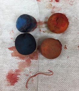 The surgical team started her procedure with her spay, both ovaries and the uterine body were removed. Then the interesting stuff began! We made an incision into the stomach (gastrostomy) and removed two nerf balls. We repaired the stomach and then went hunting through the intestines for the other two Nerf balls. Unfortunately for Molly, the Nerf balls were located in different areas of the intestine requiring two separate incisions (enterotomies). In the second enterotomy, we found a surprise – a live roundworm! You never know what you are going to find inside those intestines. Roundworms are common in puppies and easily treated.